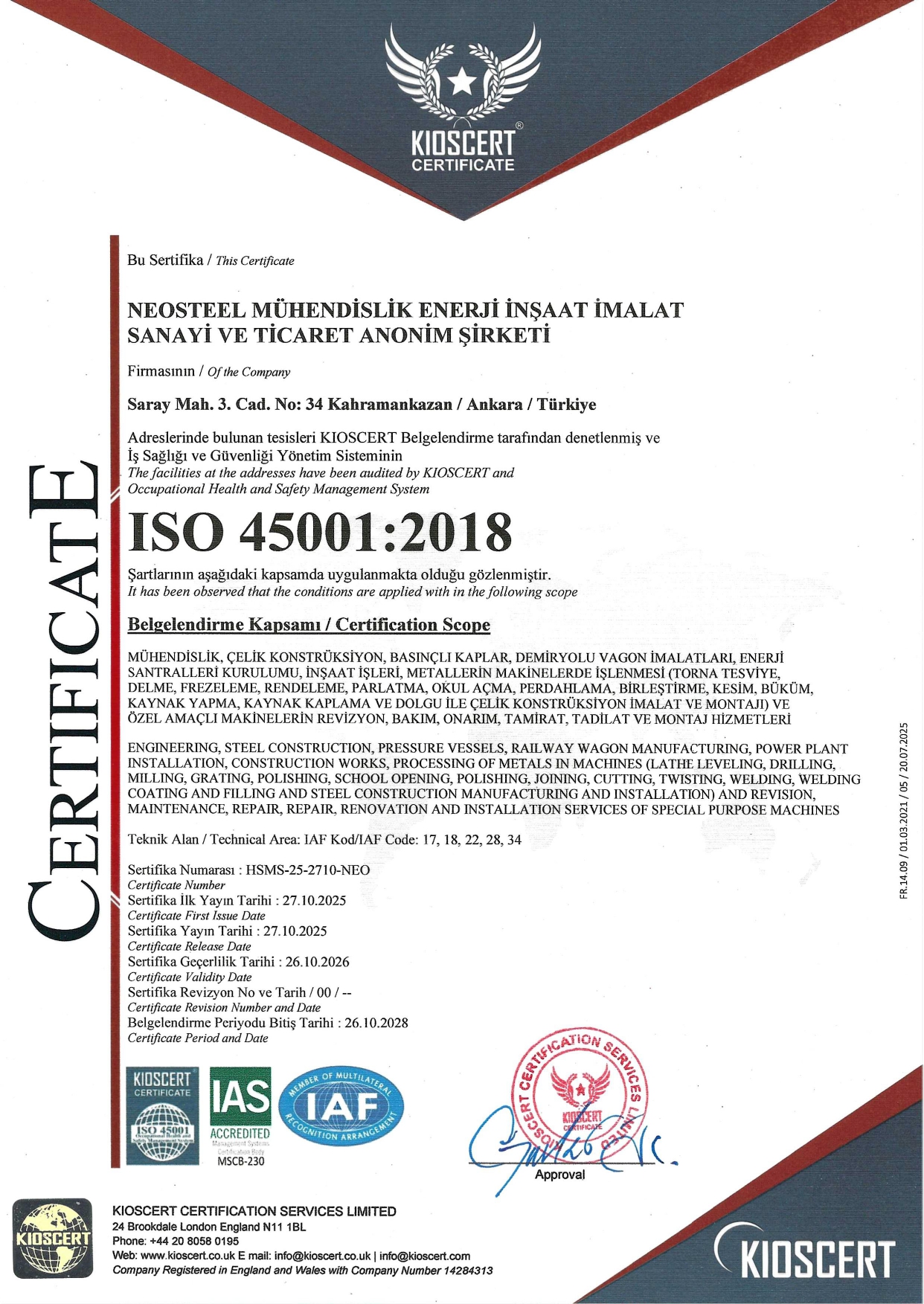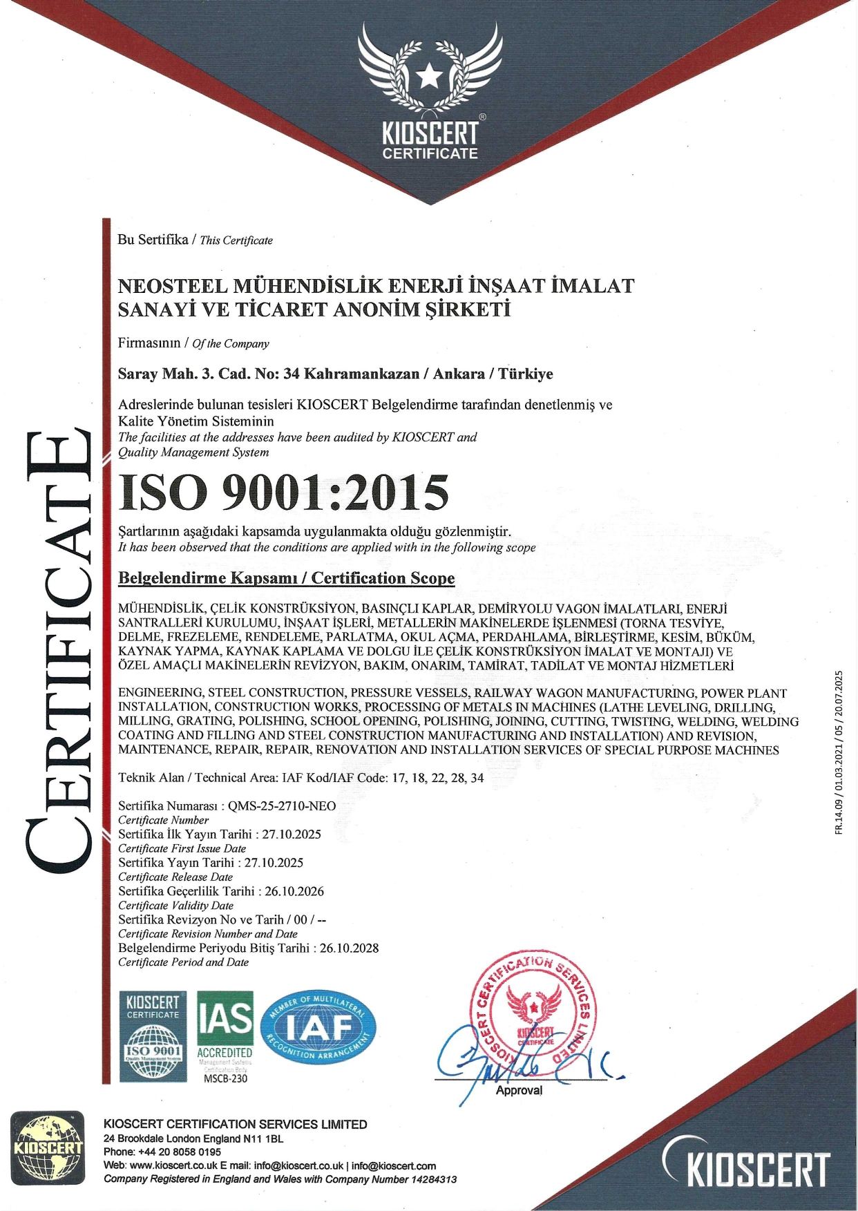 Neosteel Mühendislik olarak, tüm faaliyetlerimizi uluslararası kalite standartları çerçevesinde yürütmeyi ilke ediniyoruz. Müşterilerimize sunduğumuz hizmetlerde güvenilirliği, sürdürülebilirliği ve yüksek kaliteyi garanti altına almak için gerekli tüm yönetim sistemlerini benimseyerek uyguluyoruz.